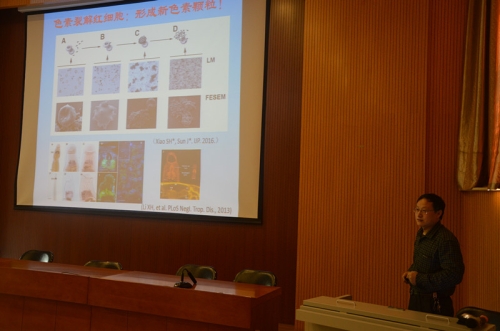 孙军讲解了血吸虫、疟原虫色素形成的生物学意义,阐述了血吸虫摄血和青蒿素抗疟的原因,并介绍了青蒿素药物抗疟机制和血吸虫色素的形成机制提示了青蒿素抗疟机制等内容。