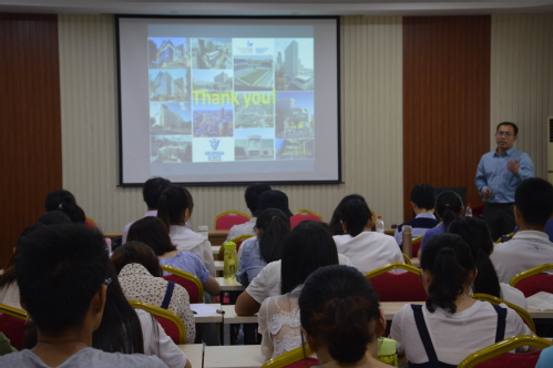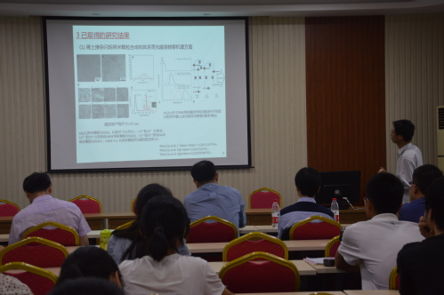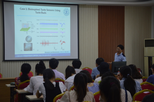 报告中,吴春生研究员以“仿生嗅觉和味觉传感与检测技术及应用”为题,简要阐述了动物的嗅觉、味觉转换为分子化学信号的原理及过程,并展现了现在仿生嗅觉、味觉传感与检测技术的实际应用。张明真研究员在报告中指出了传统给药方式与纳米载药给药方式的不同,通过图片向在场师生展示以生姜为来源的纳米载药,并提出了从水果、蔬菜中提取出相关纳米材料治疗疾病的展望。蔡文博士以“基于闪烁纳米颗粒的生物医用功能材料”为主题展开讲解,从基于闪烁纳米颗粒的诊疗一体化影像探针和含高浓度纳米颗粒的透明塑料闪烁体的设计制备及其γ射线探测χ射线成像两方面介绍了研究内容,从MIL-100(Fe)合成和表征、光敏分子载体、探针用于细胞、体内肿瘤成像以及影像指导的治疗方面做出具体的前景应用介绍。