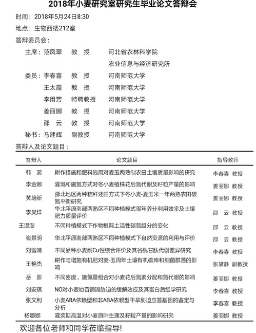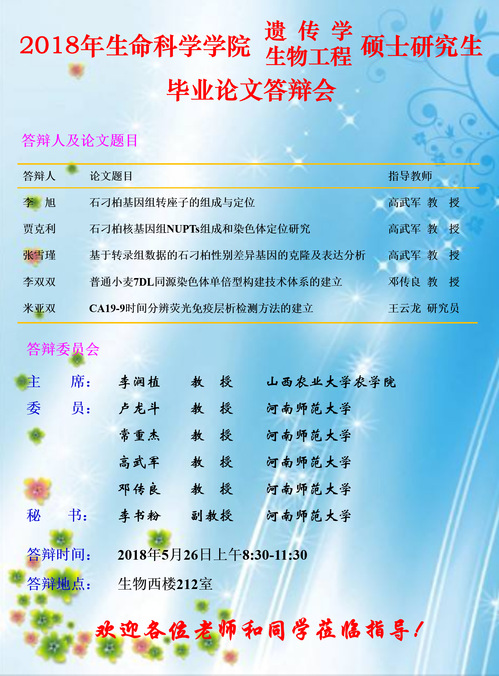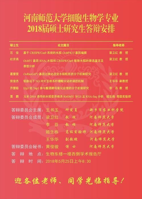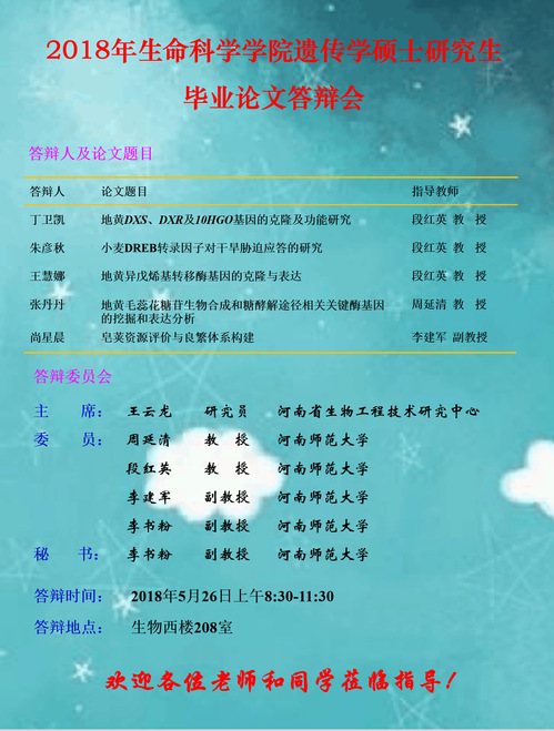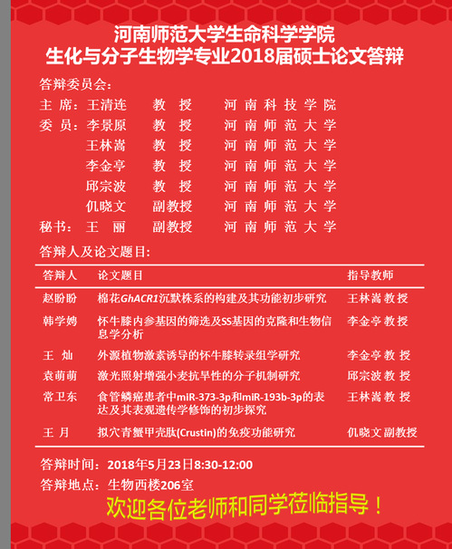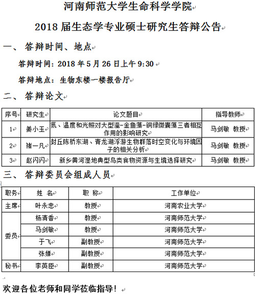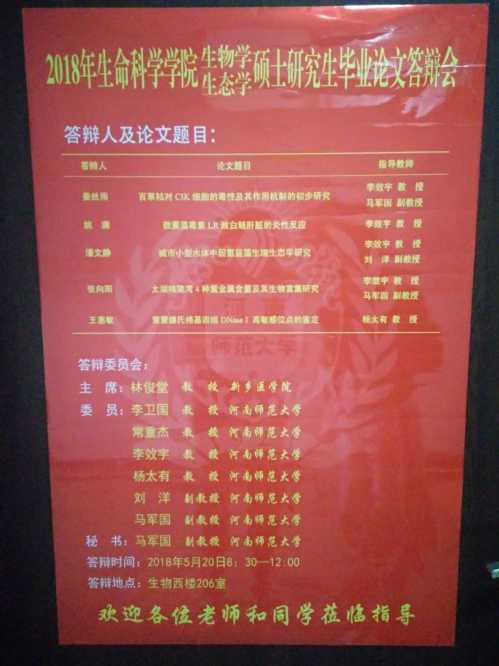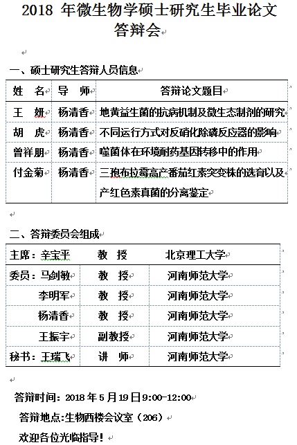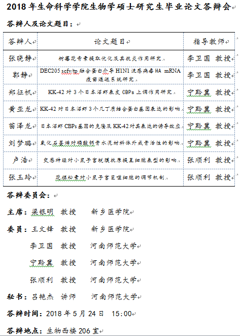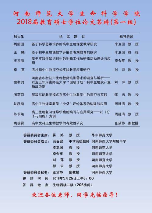生命科学学院2018届研究生各专业、方向学位论文答辩已相继开启,欢迎广大师生参与指导!