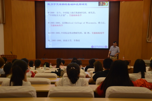报告会中,王建华研究员首先向大家简要介绍了中科院上海巴斯德研究所创建的历史及其发展历程,并说明其科研定位中关于重大传染病的致病机制及防治策略进行的研究。王建华研究员通过阐述HIV患者的患病原因及HIV病毒进入人体的方式解释了两个聚焦于当前艾滋病领域的关键性科学问题:一、性传播是HIV新发感染的主要途径;二、HIV在体内潜伏,不能被药物治疗,并且根除潜伏机制的方法尚待深入研究。报告结束后,在场师生结合所讲内容及所学提出了自己的疑问,王建华研究员均耐心细致地进行解答,师生们纷纷表示受益匪浅。