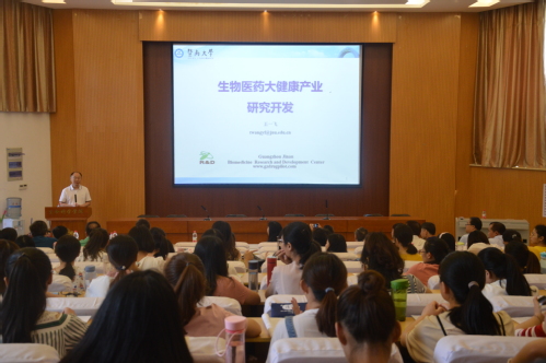 应我院邀请,9月13日上午,暨南大学王一飞教授在生物报告厅做了一场题为“生物医药大健康产业研究开发”的学术报告,院长余国营、我院部分教师以及研究生等一百余人聆听了本次报告会。报告会由我院院长余国营主持。