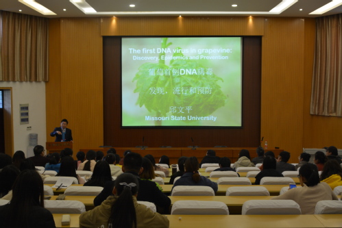 邱文平教授从葡萄病毒GVCV的发现、起因、病源以及其传播媒介四个方面展开论述。首先邱文平教授通过列举野生葡萄病例叶脉坏死的症状,发现被野生葡萄病毒株嫁接后的实验植株出现同样症状,并展开阐述了一系列GVCV病毒与葡萄植株患病联系的实验。邱文平教授以蛇葡萄实验为例,通过测定三株葡萄植株的GVCV病毒基因组,发现同种病毒核苷酸之间有较大差异性,依此发现GVCV病毒存在生物多样性。接着,邱文平教授阐述了在乡村葡萄中发现Norton诺顿葡萄等抗病毒葡萄植株的实验过程,并表示后续将展开调查具体抗病基因。邱文平教授的报告内容充实,语言幽默,在场师生都收益颇深,并且邱文平教授对在场师生提出的问题进行了细致耐心的解答。