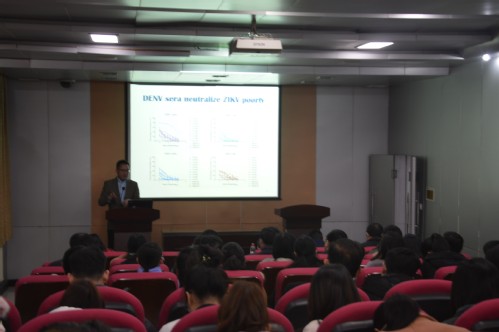 11月21日上午,受我院邀请,中科院上海巴斯德研究所金侠研究员于生物东楼报告厅作了一场题为“Antibody-dependent enhancement in Dengue and Zika virus infections”的学术报告。学院相关教师,研究生代表近百人聆听报告。本次报告由余国营院长主持。