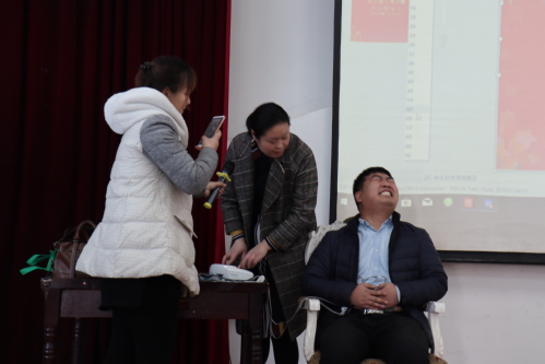 活动伊始,新乡市妇幼保健院妇幼保健科赵医生首先为到会女职工讲述女性分娩历程、具体的疼痛等级和分娩技巧等。接下来,在体验环节,学院10余名男教师依次上台参与分娩之痛体验。据赵医生介绍,疼痛体验采用的仪器是通过电极片将渐序输出的电磁波透射到皮肤深层,模拟阵痛的过程,让体验者感受到类似于拧、撕、拉、吸、捶等动作刺激,最高可达到分娩时的十级疼痛。