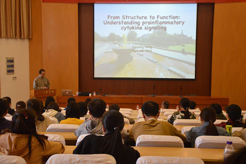 4月22日下午3点,应我校邀请,美国俄克拉马州立大学Junpeng Deng教授在生物报告厅作了题为“From structure to function: Understanding proinflammatory cytokine signaling”的学术报告。此次报告会由生命科学学院院长余国营教授主持,我院师生100余人一起聆听报告。