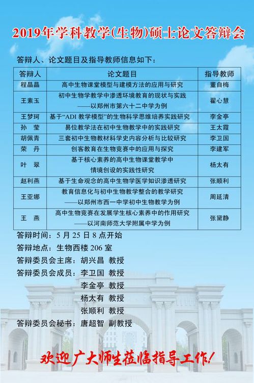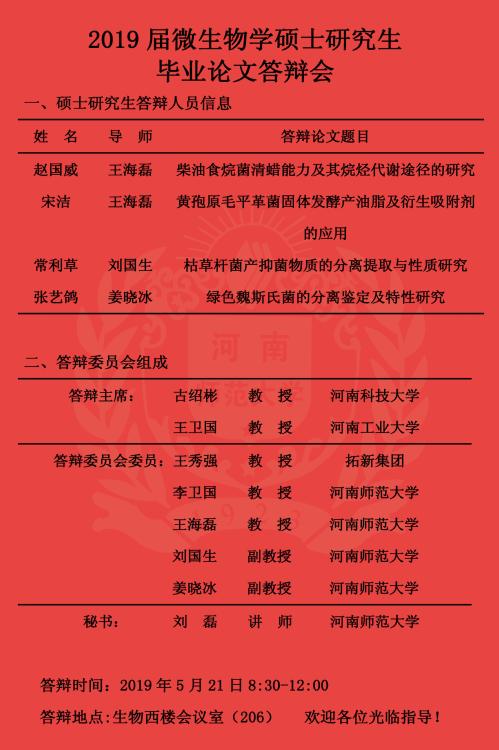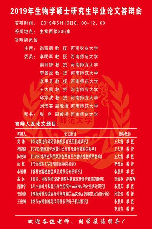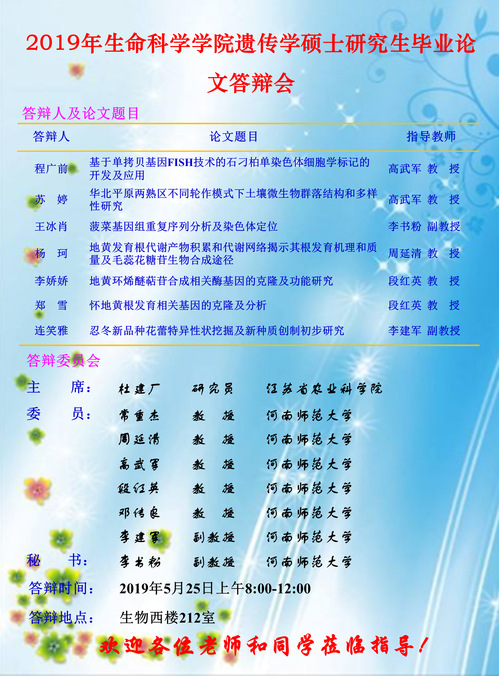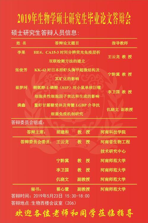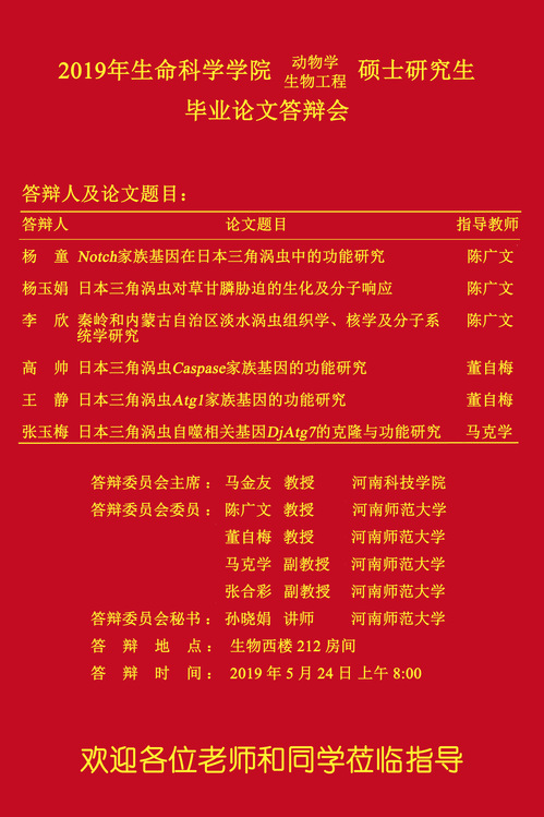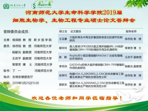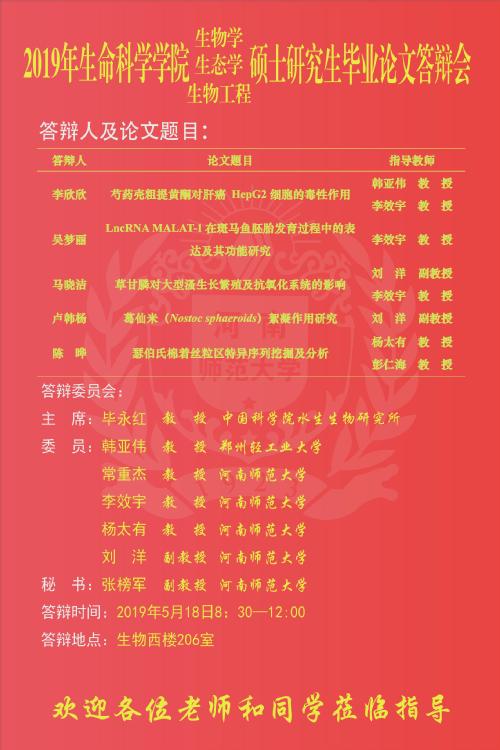 生命科学学院2019届研究生各专业、方向学位论文答辩已相继开启,欢迎广大师生参与指导!
