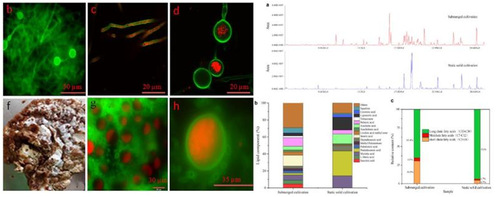 课题组通过固态静止发酵和传统液态发酵比较,发现固态静止发酵除了能够大量节约成本外,在发酵过程中P. chrysosporium能够产生大量的厚垣孢子,并在厚垣孢子中积累长链饱和脂肪酸,随后利用代谢组和转录组技术详细分析了长链脂肪酸组成及产生的分子机制。该研究为微生物脂类物质低成本生产提供了新的思路。