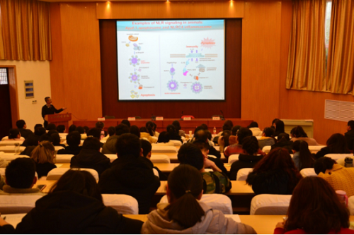 随后,柴继杰作了题为“Nucleotide exchange and activation mechanisms of a plant NOD-like receptor(NLR)”的学术报告。报告中,他从植物NLR和动物NLR的区别出发,以NOD-like receptor(NLR, NOD样受体)家族的结构与功能作为主要研究方向,通过结构生物学和分子生物学手段,解析病原体激活受体蛋白引发免疫反应的分子机制,阐述了NLR的基本生化性质和结构基础及其在植物免疫方面的作用。
