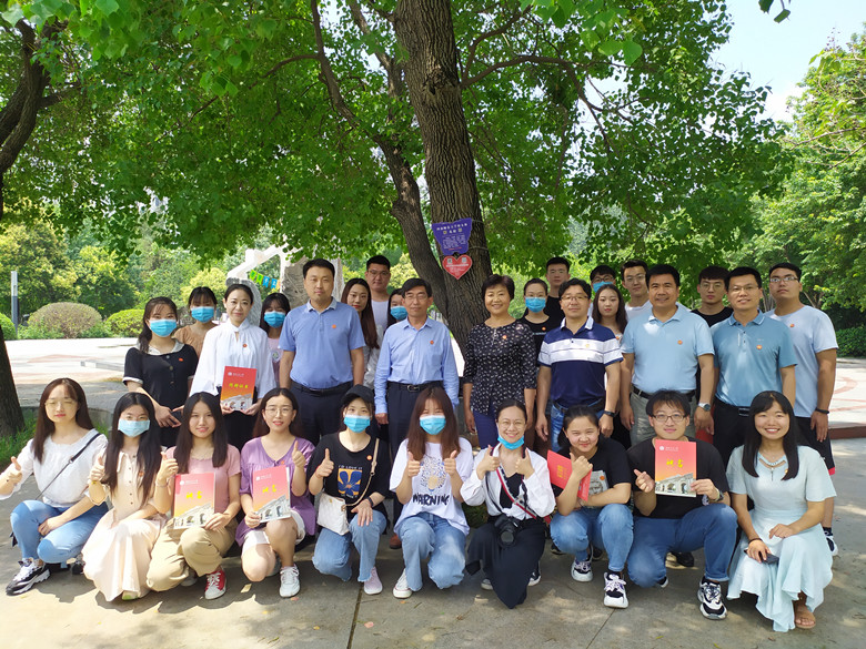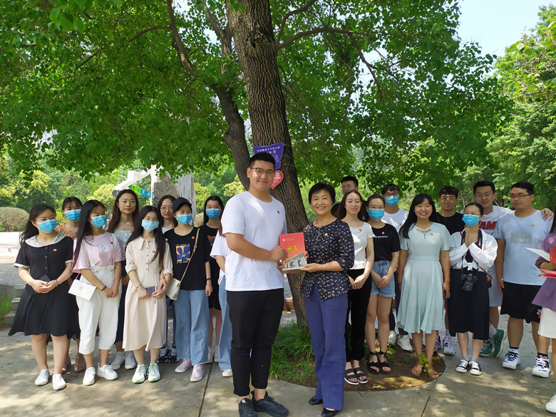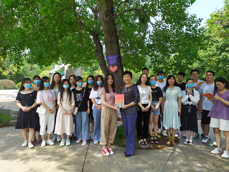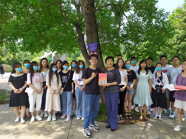 在枝繁叶茂的乌桕树下,生命科学学院2020届本科生辅导员王芳代表年级481名校友对乌桕树进行认捐,校友工作办公室主任魏海琴向年级颁发捐赠证书和校友联络员证书。