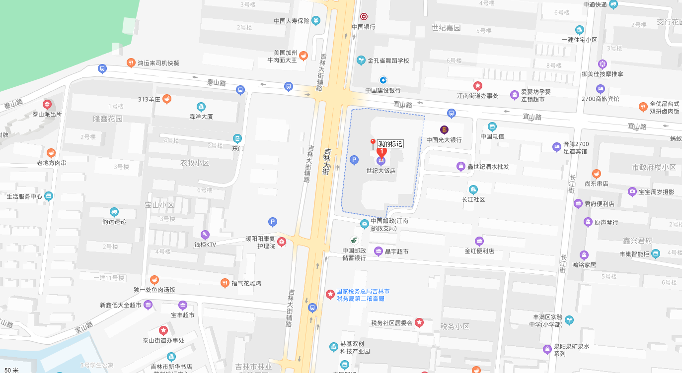 地址:世纪大饭店(吉林省吉林市丰满区吉林大街77号, 宜山路与吉林大街交汇处)