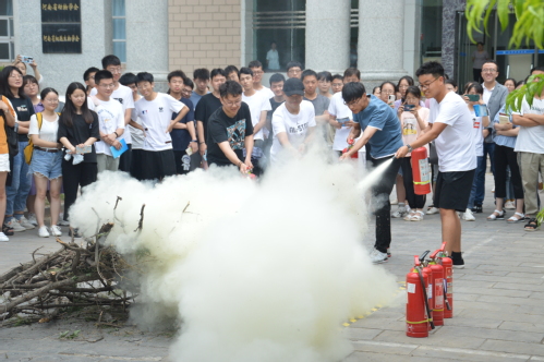 河南省消防协会专职教员杜通从实验室危险源、消防安全四个能力、灭火工具的正确使用方法等几个方面对消防安全知识做了系统而全面的讲解,他借助照片、视频等向参会师生展示了近年来发生的典型火灾案例,并向在场师生讲解了正确的灭火和逃生方法。讲座结束后,杜通组织师生进行户外灭火实战演练,他亲自示范如何正确使用灭火器,强调使用灭火器的注意事项。随后,在模拟场景下,老师和同学们默契配合,使用干粉灭火器将指定燃烧物扑灭。演练结束后,师生们纷纷表示自己收获良多,自身的消防安全意识得到了进一步的增强。