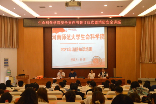 为进一步提升我院师生的安全意识,加强学院师生对火灾防控和突发事件的应对能力。6月16日下午,生命科学学院于生物报告厅举办安全责任书签订仪式暨消防安全知识讲座,河南省消防协会专职教员杜通,学院党委副书记朱国超、副院长姜丽娜及学院师生代表共150余人参与本次讲座。本次活动由副院长陈建军主持。
