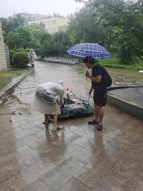受汛情影响,我院近670名学生饮食生活受到影响,行政党支部书记杨刚刚同志带领行政人员,冒着大雨,在齐腰深的水中涉水三公里,利用皮划艇,徒步往返近四小时为学生采买并送来第一批生活物资。