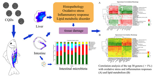 本论文以我国丰富的淡水鱼类—鲤鱼(Cyprinus carpio)为材料,研究了CQDs 对鲤鱼的潜在毒理学机制。结果表明,CQDs慢性暴露具有生物累积效应,可诱导氧化应激并引起炎症反应和脂质代谢紊乱,导致肠道和肝脏组织损伤。16S rRNA序列分析显示肠道菌群多样性和丰富度降低,有害菌相对丰度增加,有益菌相对丰度下降。生物信息学分析探讨了毒理学反应与肠道微生物群变化的关联。最后,从肠-肝轴的角度阐明了 CQDs 诱导毒性的可能机制。这些发现不仅将增强对 CQDs 的生物相容性和风险评估的认识,而且还将扩大对肠道菌群在生态毒理学中作用的理解。