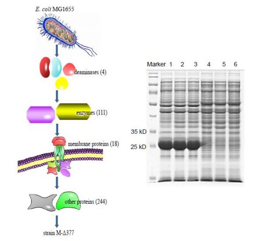 图1大肠杆菌的基因组消减程序(左图)及目的蛋白在底盘生物中的表达(右图)。