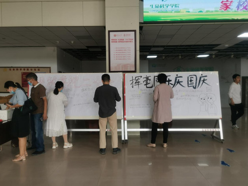 为迎接党的二十大胜利召开和新中国成立73周年华诞,推进党史学习暨爱国主义教育,丰富校园文化生活,10月1日上午,生命科学学院在生物西楼大厅举行主题为“喜迎二十大,挥毫同乐庆国庆”的留言活动,学院全体师生参加了此次国庆特色活动。