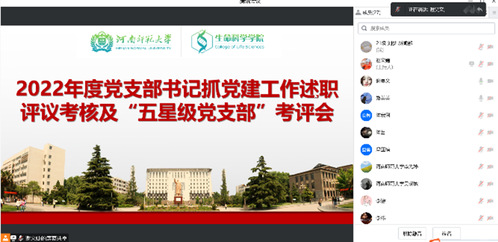 为深入学习宣传贯彻党的二十大精神,充分发挥各支部战斗堡垒作用,推动基层党建全面纵深发展,2023年1月10日上午,生命科学学院通过线上线下相结合的方式开展2022年度党支部书记抓党建工作述职评议考核及“五星级党支部”考评,院党委委员、各支部书记、委员和党员代表参加会议,会议由学院党委副书记朱国超主持。