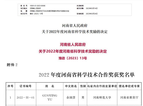 近日,河南省人民政府正式发布了关于2022年度河南省科学技术奖励的决定(https://www.henan.gov.cn/2023/03-24/2713061.html),我院余国营教授获得科学技术合作奖。