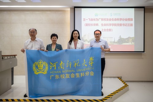 广东校友会会长王一飞教授致辞,他对生命科学分会成立表示祝贺,并作为广东校友总会代表为生命科学分会授旗,生科分会会长官道刚教授代表分会接受会旗。