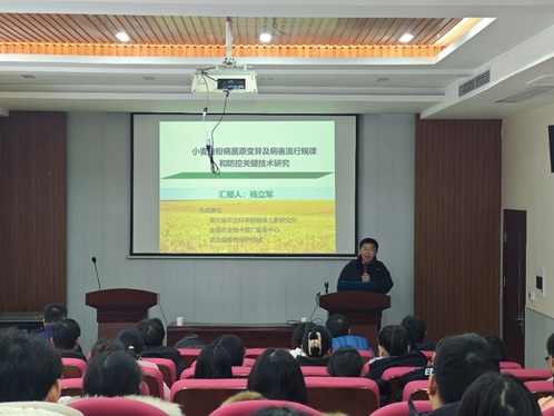 杨立军的报告题为“小麦白粉病菌原变异及病害流行规律和防控关键技术研究”,杨立军从小麦白粉病危害现状、流行规律、种群结构、白粉菌基因组、品种抗病性评价、防控药剂筛选与创制以及今后的研究重点等方面进行介绍。他指出,高海拔地区自生苗上越夏分生孢子是白粉病主要的初侵染源,残存活至正季秋苗子囊果释放子囊孢子是次侵染源。此外,白粉病流行与气候因素、栽培方式和品种抗性等因素密切相关。