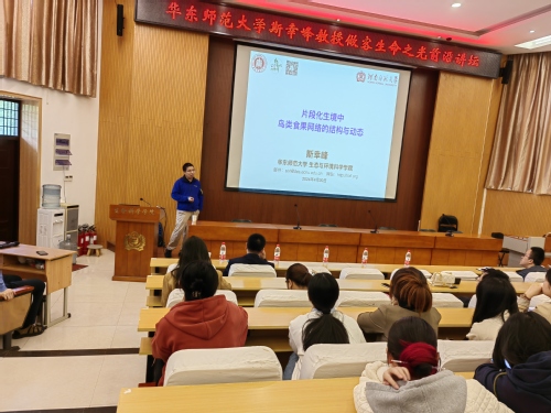 4月20日上午,应生命科学学院邀请,华东师范大学博士生导师斯幸峰教授莅临我校,作题为“片段化生境中鸟类食果网络的结构与动态”的学术报告。报告由生命科学学院副院长于飞主持,学院师生100余人参加。