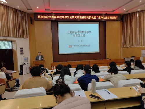 10月31日上午,应生命科学学院邀请,中国科学院成都生物研究所的谢锋研究员做客“生命之光前沿论坛”,作题为“无尾两栖动物繁殖腺体结构及功能”的学术报告,学院师生百余人参加。