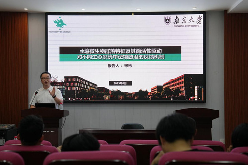 宋彬副研究员首先介绍了根系微生物群落特征及其酶活性驱动对不同逆境胁迫的反馈机制、可降解与传统微塑料添加对根际热点微生物抗性影响、有毒金属污染浓度对土壤酶的热点强度及微生物群落结构的影响、不同时间序列的生物土壤结皮内的古菌群落关键功能,最后介绍了气候变化对作物根际微生物群酶活性、结构和生长策略的影响。报告结束后,与会师生就微塑料、重金属和气候变化下微生物关键结构和功能及其在区域生态保护应用等问题同宋彬副研究员进行了深入的交流和讨论。