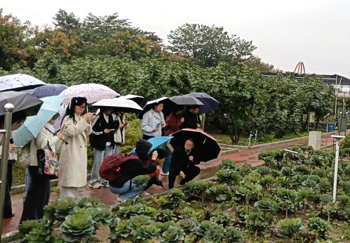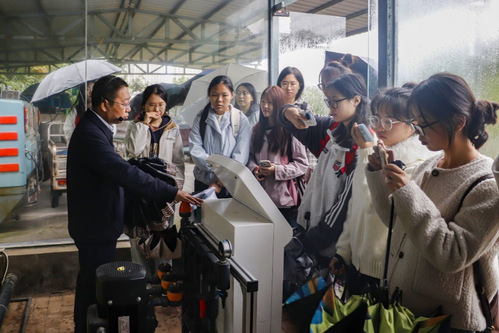 活动伊始,在研究所户外试验田,刘战东研究员冒雨讲解了智慧灌溉系统的全流程——从智慧井堡的水源供给,到“中灌云”平台的智能调控;针对不同作物的精准灌溉模式;多种先进的灌溉技术和设备,包括固定式喷灌、自适应低压滴灌、生态农业循环过滤处理、手摇清洗过滤与雾化微喷灌等技术。让同学们对农业灌溉的智能化发展有了宏观且清晰的认识。