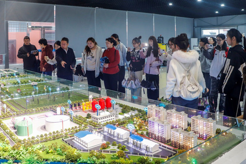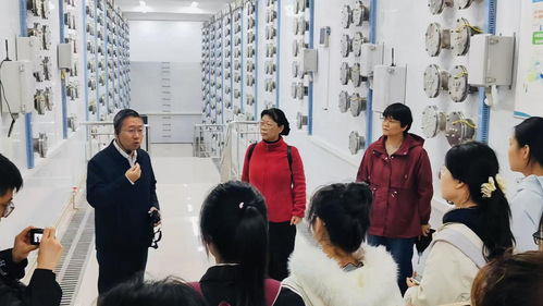 随后,师生们参观了基地的智慧灌溉科研展示厅。在巨大的农业灌溉科研模型前,刘战东研究员细致讲解了智慧灌溉系统的整体布局与运行机制,从水源调配到田间灌溉的全流程模拟,先进技术和设备的研发和应用成果,让同学们对农业灌溉领域的前沿技术有了更直观的认识,也为农灌所取得的丰硕科研成果赞叹不已。
