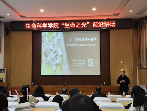 10月22日上午,应生命科学学院邀请,福建农林大学黄晓磊教授做客“生命之光”前沿讲坛,作题为“社会性和物种间关系:一个跨不同生物界的研究模型能告诉我们什么”的学术报告。报告会由生命科学学院副院长于飞主持,学院师生百余人参加。