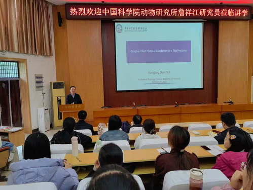10月25日下午,应生命科学学院邀请,中国科学院动物研究所詹祥江研究员做客“生命之光”前沿讲坛,作题为“Qinghai-Tibet Plateau Adaptation of a Top Predator”的学术报告。报告会由生命科学学院副院长于飞主持,学院师生百余人参加。