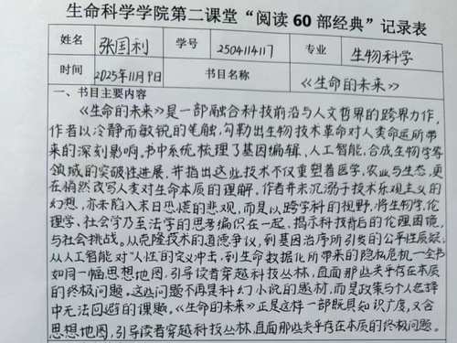 活动伊始,学院结合第二课堂“阅读六十本经典”培养要求,精心筛选出《红日》《我们为什么生病》《中国通史》等涵盖文学、科普、历史、哲学的经典书目,为不同专业背景的学生提供多元阅读选择。活动负责人通过班级群通知的形式,向同学们详细解读活动意义、阅读要求与读后感提交规范,充分调动同学们的参与积极性。活动过程中,线上“感悟提交”专区成为核心交流阵地,同学们围绕选定经典书目,以读后感为主要载体,将专业知识与书籍内容深度融合,多角度解读书中内涵。学生们在分享中的畅谈思想启迪、情感共鸣与知识收获,形成读、思、悟、想的良好氛围。活动结束后,同学们纷纷表示不仅在课余时间能够充实自我、真切体验到文化魅力,更在经典书籍的浸润中拓宽知识视野、涵养人文情怀。