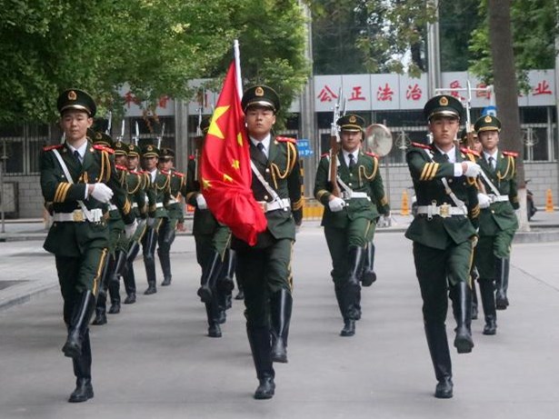 7时整,升国旗仪式正式开始。28名国旗护卫队队员踢着威武的正步走向升旗台,队形井然有序、动作铿锵有力、声音豪迈洪亮。激越雄壮的国歌奏起,鲜艳的五星红旗冉冉升起,全场师生行注目礼,现场肃静,激起在场每一个人的民族自信心和自豪感。