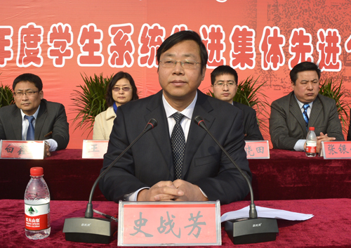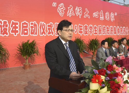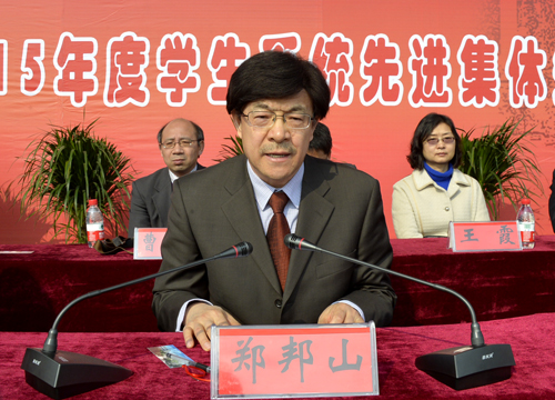 郑邦山代表学校向取得优异成绩的先进集体和先进个人表示热烈的祝贺,向砥砺耕耘的广大教师致以崇高的敬意,向无私奉献的全体政工干部表示衷心的感谢。随后,他以“青春须早为,岂能长少年”为题作了重要讲话,他指出,师大是一所有着光荣传统的百年学府,立校之日起,师大便肩负起“为现实培养高级专门人才”的理想,抗战年代,师大辗转办学,依然坚定“读书不忘救国”的信仰。在苦难岁月中形成的家国情怀、忠诚大爱,已经成为学校的思想基因,融入了我们的血脉,成为每一个师大人成长道路上的精神坐标。今天的师大已经成为河南省人民政府和教育部共建高校,如今站在新的历史起点上,全校师生正紧紧围绕建设“有特色高水平区域示范性大学”的目标,凝心聚力,奋发进取。他向广大同学提出三点希望: