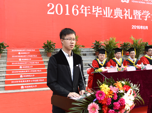 旅游学院李辛义代表毕业生表达了对母校的感恩之情。教师代表法学院于庆生老师用幽默的语言描述了毕业生专属的“河师大印记”,希望同学们学会独立思考,敢于追求幸福,坚守理想信念。校友代表生命科学学院89届毕业生高涛甫以自身经历勉励毕业生要珍惜时光,积极奋进,感念母校。