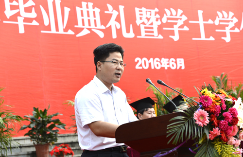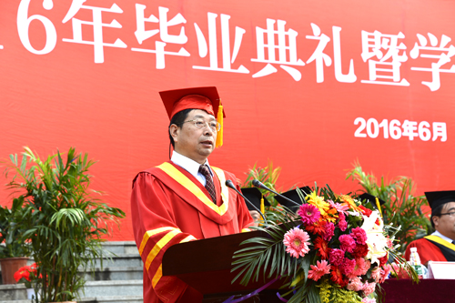 校长常俊标代表学校向圆满完成学业的各位同学表示热烈的祝贺,向潜心育人的广大教职员工致以崇高的敬意,向所有关心支持同学们成长成才的广大亲友、校友和各界人士表示衷心的感谢。他充分肯定本届毕业生在学风建设、科技创新、校园文化建设等方面为学校的积极付出和丰硕成果,并以 “让奔跑成为一种习惯,用奔跑书写人生华章” 为题,满怀深情地为毕业生上了最后一课。常俊标说,担当社会重任,创造辉煌人生,不是一句简单口号,而是一个需要通过不断奔跑、不断奋斗才能实现的人生追求。同学们要明确“奔跑”的目标,要大胆去试,大胆去闯,只要有目标,一切皆有可能;要坚定“奔跑”的信念,坚持“永不抛弃,永不放弃”的信念,让信念推着你跑,朝着既定目标去努力、去冲刺;要增强“奔跑”的能力,勤于学习,敢于创新,勇于实践,让能力从学习中得来,在创新中提高,并通过实践得到检验和发展;要珍惜“奔跑”的资本,用饱满的精神和充沛的体力为人生的奔跑作支撑,快乐学习、工作和生活;要享受“奔跑”的过程,注意松弛有度,学会欣赏沿途的风景,享受爱的温暖,多陪家人,多交朋友,时刻保持感恩的心态。