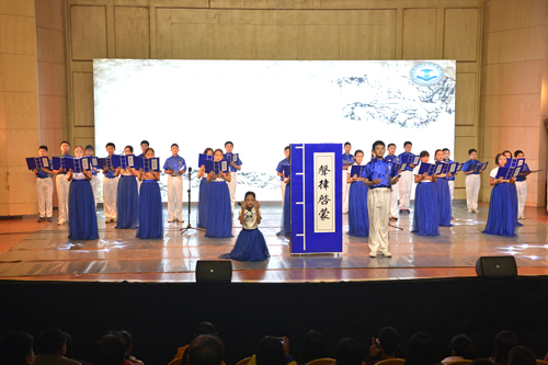 仪式上,由主办方精心编排的各类经典书籍、篇章诵演依次呈现,精彩纷呈。由我校附属小学的学生们带来的诵演《新学堂歌》别出心裁,将富有特色的民族舞与千年传诵的诗歌结合起来,把《春晓》《悯农》所述内容演绎的淋漓尽致,令人耳目一新;师大附中的学子们带来的《声律启蒙》则体现出对传统文化的尊重和继承,清晰的咬字、明朗的韵律警醒着在场师生勿忘中华文化,提升自身文学修养;政治与公共管理学院选送的《南京大屠杀死难者国家公祭日祭文》,语调慷慨、大气浩然,告诫师生牢记历史、不忘过去、珍爱和平、开创未来。文学院带来的中国经典名著《雷雨》、外国语学院呈现的英国经典名著《温莎的快乐女人》片段展演等节目,以深受同学们喜爱的舞台剧形式,再现了经典之作的艺术魅力,引人入胜、发人深思,现场掌声迭起,高潮不断。
