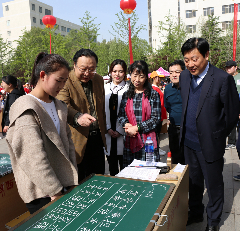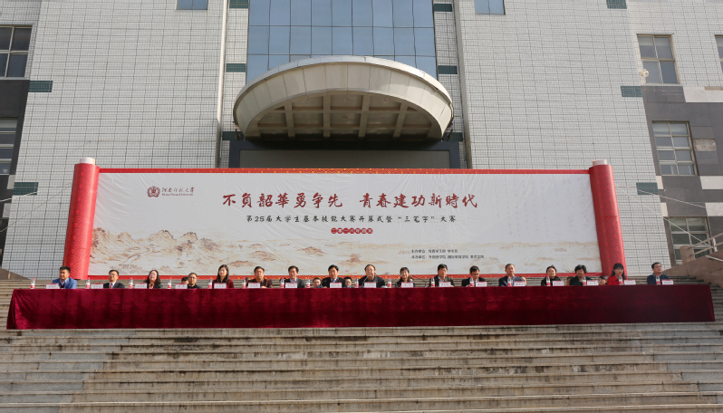 泼墨挥毫,强师兴国弘扬十九大;书韵流香,奋进之笔书写新华章。4月15日上午,我校第二十五届大学生基本技能大赛开幕式暨“三笔字”比赛在图书馆前广场举行。本次比赛由党委学工部 学生处主办,外国语学院承办,以“不负韶华勇争先,青春建功新时代”为主题,特邀原河南省文联主席、河南省政协常委、中国书法家协会理事、河南省书法家协会主席杨杰女士莅临我校指导。校党委书记赵国祥、党委副书记陈广文、组委会领导小组全体成员、各学院政工干部、480名参赛选手和320名学生志愿者参加了开幕式。开幕式由党委副书记陈广文主持。