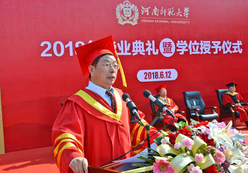 校长常俊标以《新时代不会辜负勤奋执着的人》为题发表讲话。首先,他代表学校向全体毕业生表示祝贺,带领大家共同回顾了过去四年来2018届毕业生在学习实践、品德修养、技能锻炼和科研成就等各方面的成长进步。同时,他详细阐述了学校近年来的快速发展,极大地肯定了这一过程中师大人的不懈追求和发展自信。同时他提出四点希望,与全体毕业生共勉。一是要用信仰凝聚精神力量。希望同学们坚定马克思主义信仰,将其转化为精神支柱、行动指南和前进力量,坚持“四个自信”,秉持“国家好、个人才会好”的人生信条,心有所敬,行有所止,知之愈明,行之愈笃。二是要用理想引领前进方向。希望同学们以理想为灯塔,不论是投身教育、潜心科研,还是经商从政、自主创业,都要干一行爱一行,勇做新时代青年,自觉将个人理想、价值追求融入国家和民族的事业中,书写新时代的青春之歌和精彩人生。三是要用学习夯实成长道路。希望同学们涵养知识底蕴,树立终身学习的理念,培养良好的学习习惯,坚持学用结合、知行合一,让读书学习、增长本领成为青春搏击的力量源泉。四是要用奋斗筑牢幸福基石。希望大家都做新时代的奋斗者,脚踏实地、行稳致远,在奋发有为中实现价值、享受幸福,在时代跨越中成就自我、圆梦人生。最后他强调,时代的巨大挑战,是你们责无旁贷的使命,希望毕业生时刻保持自信和坚韧不拔的精神,谱写无愧于时代、无愧于人生的辉煌乐章。