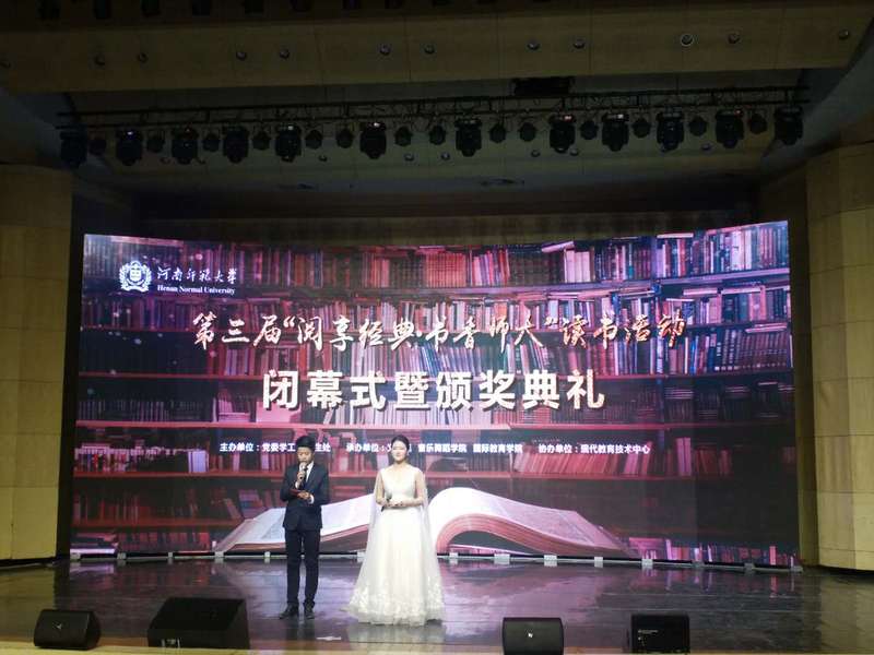 场景优美、意蕴深远的视频带领现场师生领略我校丰富多元的读书活动和读书载体,图书馆、中心花园,学校到处可见的读书场景展现了学生们饱满的读书热情。为进一步展现经典魅力,闭幕式还选拔类型多样、题材多元的优秀文艺节目进行展演。情景剧《茶馆那些事》《风声》以鲜活艺术形式再现经典,通过剧中人物的命运变化,带领观众感受了历史的厚重与风云变幻,传递的文化魅力使人沉浸其中。文学院“声传诗韵”优秀作品《我和诗的故事》采用经典古诗词与个人成长心路历程相结合的创新形式,带领现场师生领略经典古诗词之美,享受流传千年的文化古韵,朗诵者声情并茂的吟诵赢得了观众的阵阵掌声。闭幕式在群颂《青春之歌》中落下帷幕。文学院百余名学生以激情饱满的状态歌颂祖国改革开放四十年来的建设成就,展现出青年一代肩负使命、敢于拼搏的新时代精神,引发在场师生的强烈共鸣。现场采用3D环绕立体音效、LED背景视频播放,结合精心打造的优质节目,为观众带来了一场震撼人心的视听盛宴。