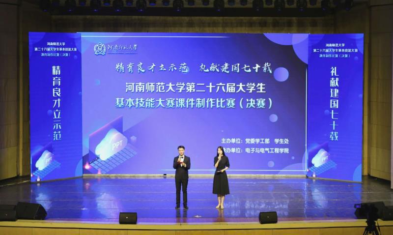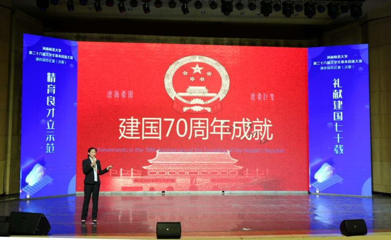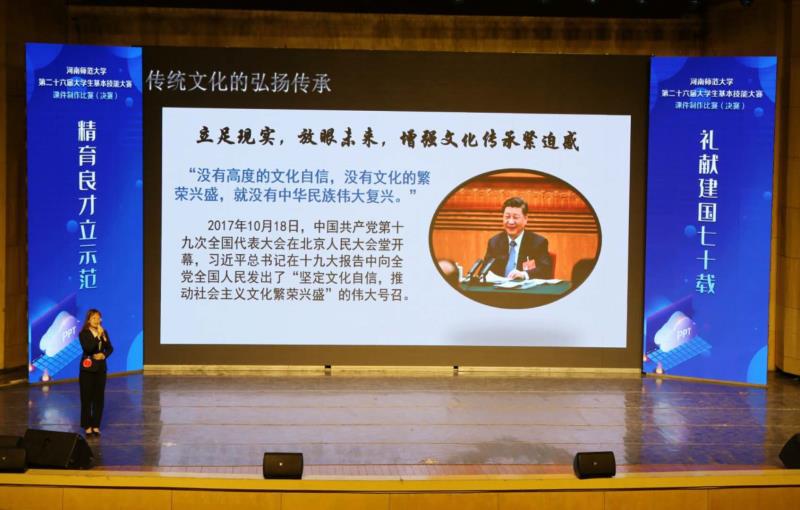 本届大赛恰逢新中国成立70周年,以“精育良才立示范 礼献建国七十载”为主题,以宣传贯彻学习习近平新时代中国特色社会主义思想和党的十九大精神为指导,22位决赛选手分别从“改革开放40周年”“70年沧桑巨变”等不同角度,结合自己的设计理念、设计技巧等展示参赛课件,献礼祖国70周年。大赛期间,由音乐舞蹈学院带来合唱《阿卡贝拉》和歌伴舞《赞赞新时代》,引起现场观众阵阵掌声。此次大赛的22份课件作品设计美观,布局生动合理,各有特色,评委老师分别从制作软件、制作内容、视觉效果等方面对其进行了精彩点评。