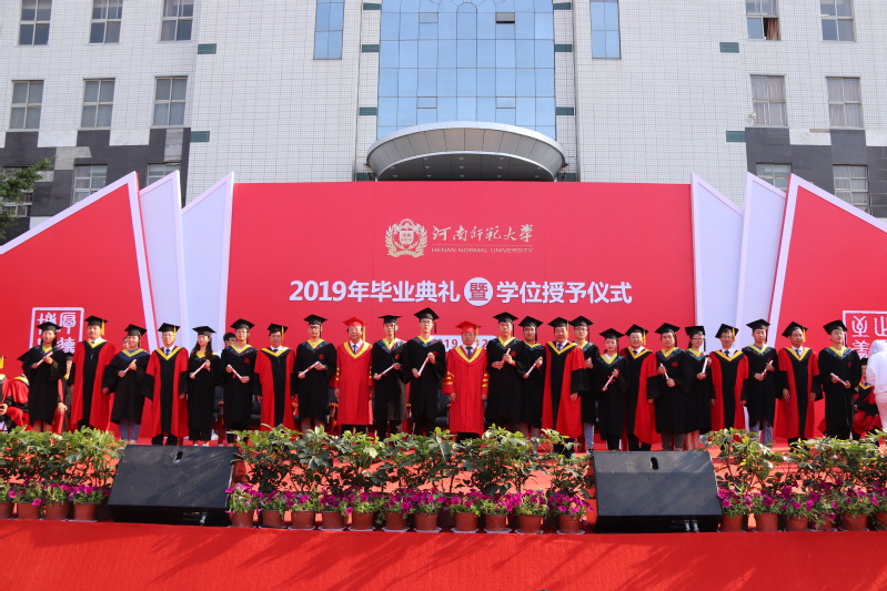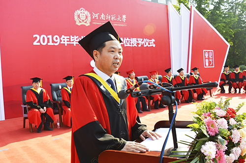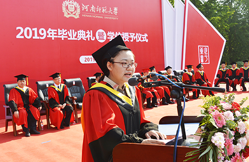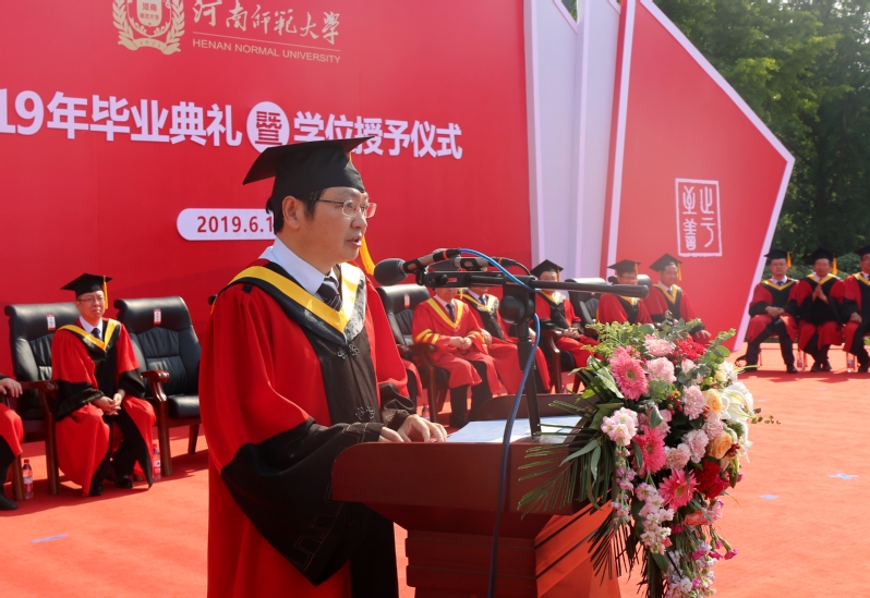 常俊标以新中国成立70周年为切入点,结合自己的人生体会,围绕“爱国报国”深情寄语毕业生。他表示,国是千万家,有国才有家。师大学子作为强国一代,要接好前辈们的接力棒,矢志不移,奋斗不止,在爱国报国中实现自己的人生价值。他勉励同学们要有“立大志”的胸怀,立鸿鹄志,做奋斗者,勠力同心,把个人青春梦想、远大抱负融入到中华民族伟大复兴的伟业当中;要有“做大事”的境界,既要仰望星空,又要脚踏实地,做到平凡之中有伟大追求,平静之中有满腔热血,平常之中有强烈责任感,在平凡的岗位上做出不平凡的业绩;要有“当大师”的追求,既读有字之书,也读无字之书,不断创新,追求卓越,努力成为可堪国家大用、能担民族重任的新时代青年;要有“成大业”的意志,抱定必胜的信心,保持一种永不服输的劲头,无惧风雨,建功立业,在坚持和拼搏中成就一番大事业。
