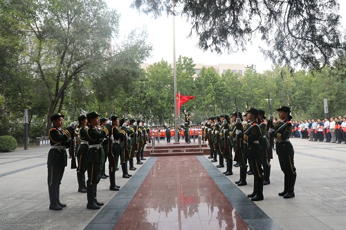 7时整,朝阳初升,升旗仪式正式开始。在现场师生的全体注目下,国旗护卫队队列整齐、步伐铿锵、精神抖擞,向国旗台走去,全场一片肃静。当雄壮的国歌奏起第一个悦耳的音符,升旗手振臂一挥,鲜艳的五星红旗徐徐升起,国旗下,全体师生庄严地向国旗行注目礼。