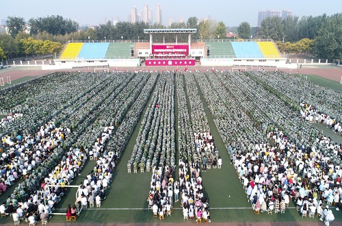 秋高气爽碧云天,八方学子负笈来。9月9日上午,我校在塑胶田径场举行2019级新生开学典礼暨军训动员大会。校领导赵国祥、常俊标、臧振春、陈广文、李学志、李雪山、马治军、张尚字、岳杰勇,中国人民解放军32150部队副政治委员贾利辉中校出席典礼。校迎新领导小组全体成员,各学院党委(党总支)书记或院长、各学院党委(党总支)副书记、牧野区武装部领导、教师代表、党委学工部工作人员、新生辅导员、校友代表、中国人民解放军32150部队帮训教官和2019级全体新生参加了此次盛会。典礼由副校长李学志主持。