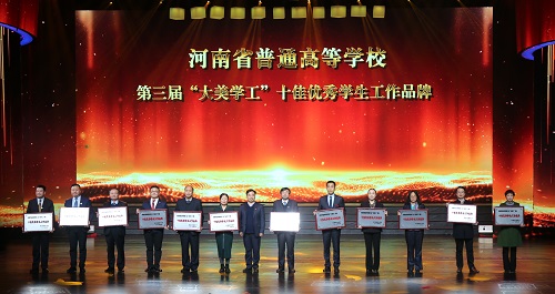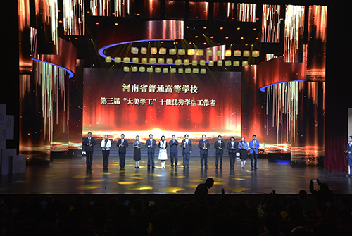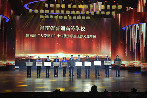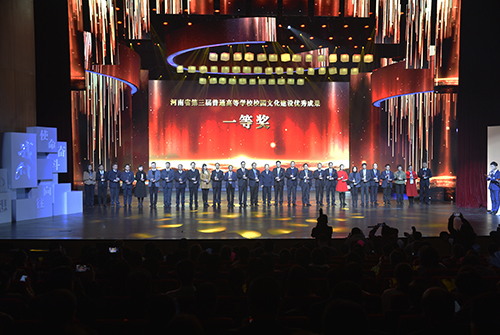 12月3日,由河南省高校工委、河南省教育厅主办,我校承办的河南省普通高等学校第三届“大美学工”颁奖典礼暨校园文化建设优秀成果展演在新乡市平原文化艺术中心举行。省教育厅党组书记、厅长郑邦山,新乡市市长王登喜,省教育厅副巡视员吕冰,省教育厅学生工作处处长李培俊,校领导赵国祥、臧振春、马治军、张尚字、岳杰勇、刘玉芳等出席颁奖典礼。各普通高校分管学生工作的校领导、学生处处长及学生工作者代表,我校各学院党政领导、职能部门负责人、全体政工干部和学生代表共计1600余人参加颁奖典礼并观看展演。