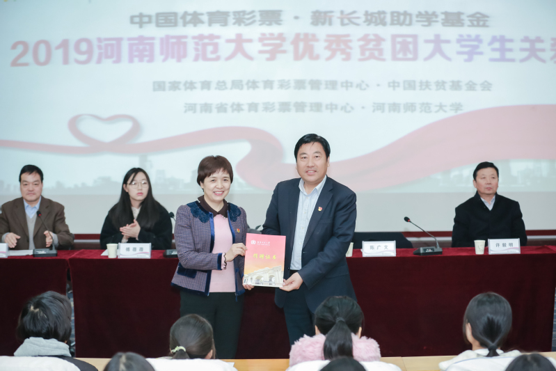 12月11日上午,“中国体育彩票•新长城助学基金”关爱优秀困难大学生资助仪式在我校举行。校党委副书记陈广文出席仪式并讲话。河南省体育彩票管理中心主任王海新,中国扶贫基金会新长城项目部傅蓓蓓,新乡市体育局局长许毅明,二十家新闻媒体、社会人士代表及各学院党委(党总支)副书记、辅导员和受助学生参加仪式。仪式由学生资助服务中心主任赵红杰主持。