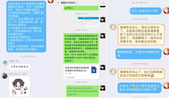 各学院辅导员第一时间采取行动,积极落实学校整体部署,通过多种渠道充分了解疫情发展情况,学习疫情防控知识,做好疫情防控工作处理预案,坚定打赢疫情防控战争的信心,切实做到了守土有责、守土担责、守土尽责。