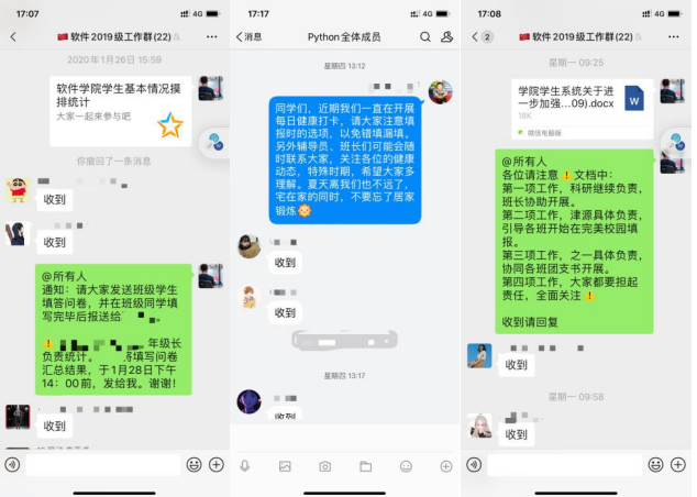 担当防控使命,责任牢记我心。生命重于泰山,疫情就是命令,防控就是责任。疫情爆发后,软件学院各年级积极构建辅导员、学生骨干、寝室长三级信息反馈机制,及时传达学校疫情防控相关公告,通过微信公众号、QQ、完美校园健康打卡等方式密切关注学生。同时,辅导员与外省学生保持密切电话沟通,随时随地掌握其生活动态,对于个别身体不适学生,给予必要心理关怀。