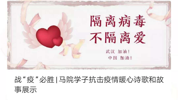 感悟社会真情,聚力共克肺炎。自2月起,学院结合学生实际情况,陆续开展短诗、暖心故事征集、海报设计、三行诗以及歌曲视频vlog等活动。同学们积极响应,以一个个暖心的故事、一幅幅动人的海报、一首首优美的歌曲来传递人间真情,向所有奋战在一线的工作人员致敬,表达我们对抗击疫情一线工作者的敬意和抗击疫情必胜的决心。