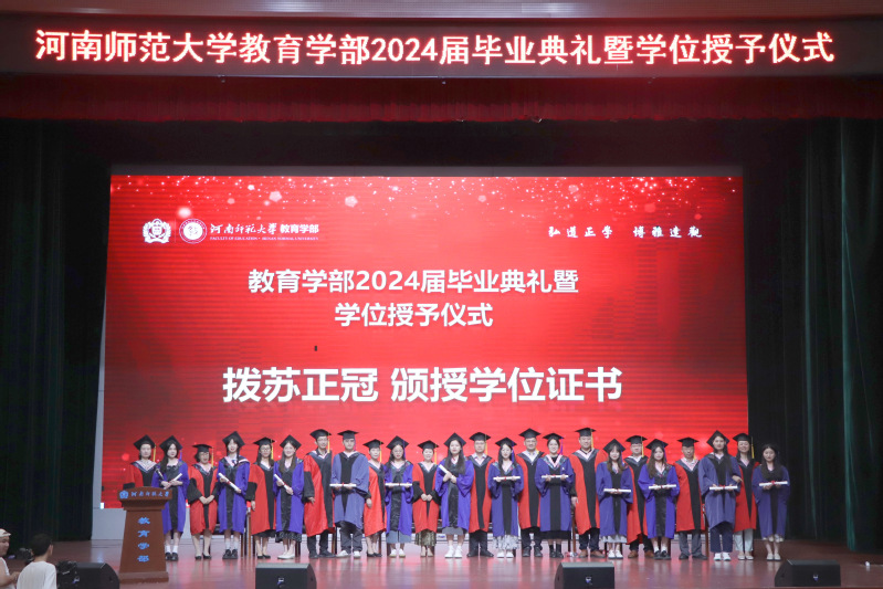 伴随一段记录毕业生师大生活点滴的毕业短片,毕业生们通过歌曲串烧的演唱,为大家献上最为真切的毕业祝福。随后,典礼在肃穆激昂的国歌声中拉开帷幕。领导老师为学院7名博士研究生,52名硕士研究生及138名本科生拨苏正冠、颁授学位证书并合影留念,这既是对同学们圆满完成学业的宣告,也寄托了学校对学子们的深切厚望。